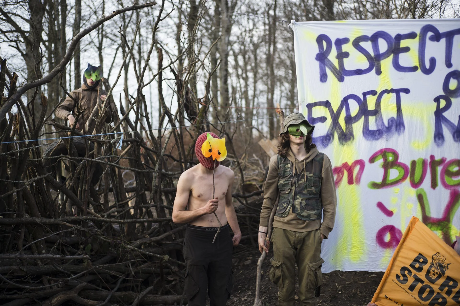Activistes antinucléaires dans le Bois-Lejuc solidaires de la mobilisation de la forêt d'Hambach en Allemagne. Mandres-en-Barrois, Meuse